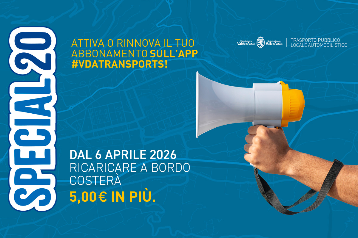 La Regione autonoma Valle d’Aosta ricorda agli utenti del trasporto pubblico che da lunedì 6 aprile entrerà in vigore un costo per la ricarica a bordo dei bus dell’abbonamento Special 20.